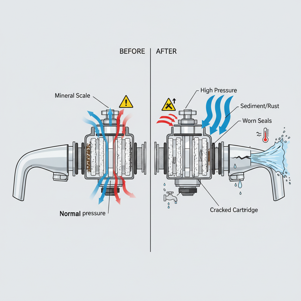 Unlike pipe leaks that drip slowly, cartridge pressure build-up happens inside a closed metal body. The external tap may appear fine—until the internal pressure exceeds material limits.